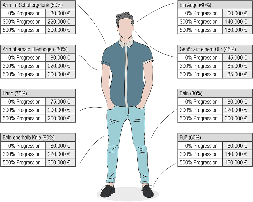 Je höher der Invaliditätsgrad und je höher die Progression, desto höher ist auch die Leistung aus dem Vertrag. Bei einem hohen Invaliditätsgrad benötigt man besonders hohe finanzielle Mittel, um das Umfeld den neuen Gegebenheiten anzupassen.